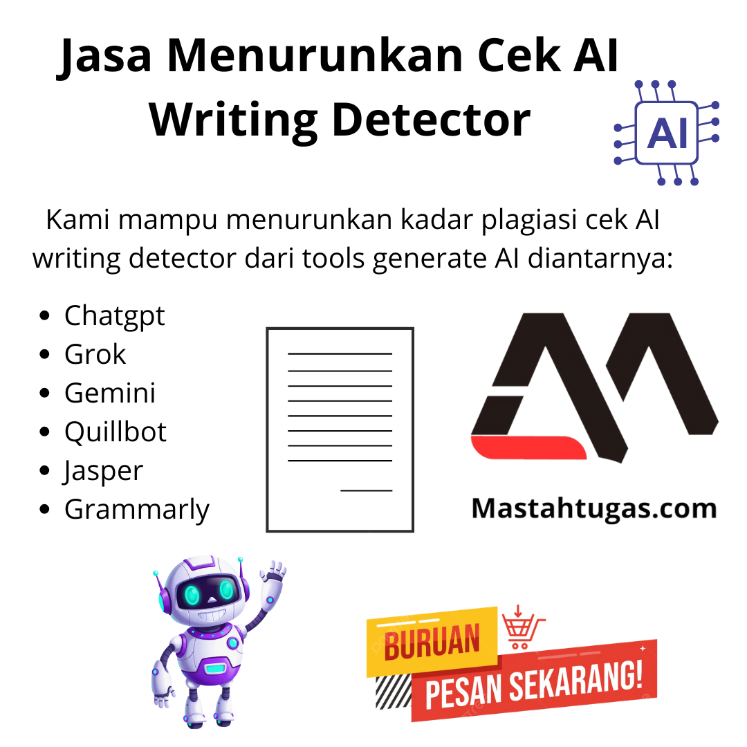 Seiring dengan ketatnya pihak kampus dalam melarang penggunaan AI untuk membuat karya tulis ilmiah, skripsi, tesis, maupun disertasi maka kami memutuskan untuk membuka layanan jasa menurunkan skor cek AI. Layanan ini cocok dipesan oleh mahasiswa yang dimana kampusnya biasanya memberlakukan kebijakan batas maksimal penggunaan AI untuk menulis tugas sebesar 30 persen. Yuks pesan layanan ini sekarang juga.